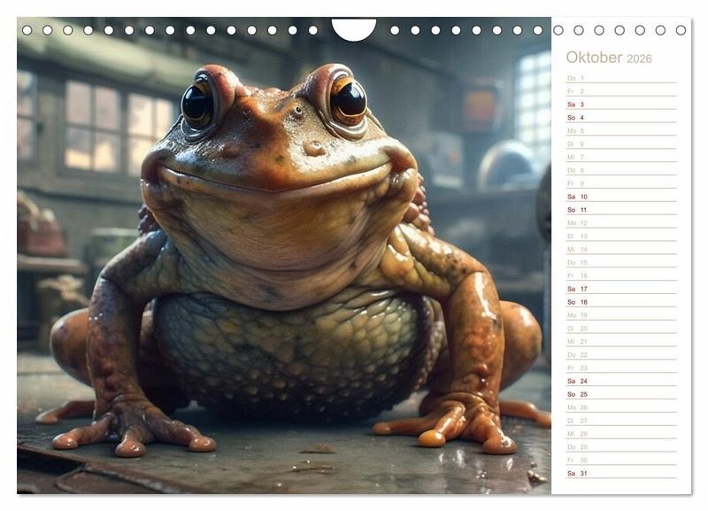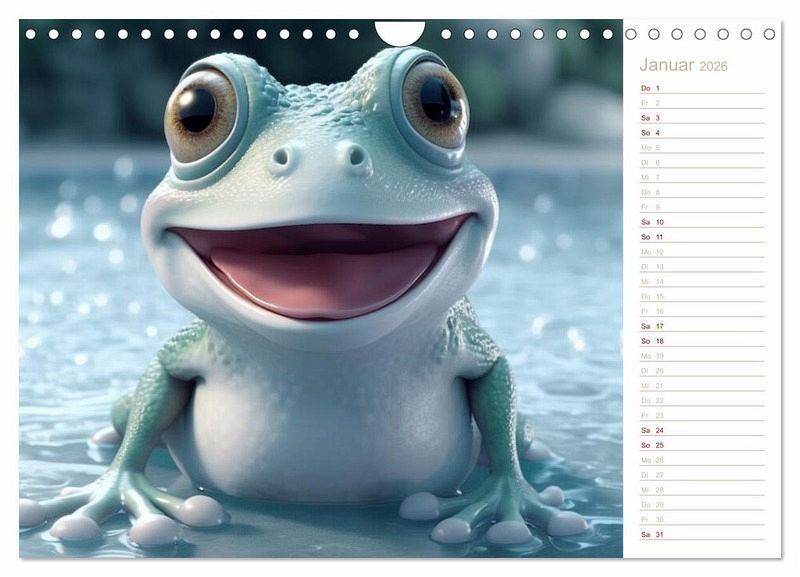 Machen Sie sich bereit, von unseren freundlichen Fröschen verzaubert zu werden! Der brandneue Kalender mit künstlicher Intelligenz erstellten Bildern ist jetzt erhältlich und bietet Ihnen eine unglaubliche visuelle Erfahrung, die Sie in die Welt der Amphibien eintauchen lässt.Jedes Bild in diesem Kalender wurde von einem fortschrittlichen künstlichen Intelligenz-Algorithmus erstellt und zeigt freundlich lächelnde Frösche in verschiedenen Umgebungen. Diese Bilder werden Sie verzaubern und zum Lachen bringen, da jeder Frosch sein eigenes einzigartiges Aussehen und Charisma hat. Von exotischen Regenwäldern bis hin zu Teichen in der Nachbarschaft - jeder Monat präsentiert eine andere Umgebung, die die Schönheit der Natur zeigt.Dieser Kalender ist der perfekte Begleiter für alle Naturliebhaber und Tierfreunde. Jeden Monat werden Sie von einem neuen, bezaubernden Bild überrascht, das Ihnen ein Lächeln ins Gesicht zaubert. Diese Bilder werden Ihre Sinne erfrischen und Ihnen helfen, einePause von Ihrem hektischen Leben zu machen.Dieser Kalender ist auch ein perfektes Geschenk für alle, die Tiere und Natur lieben. Mit diesem Kalender haben Sie nicht nur die Möglichkeit, Ihre Liebe zu Fröschen zu zeigen, sondern auch ein einzigartiges Kunstwerk zu besitzen, das Sie das ganze Jahr über begleitet.Worauf warten Sie also noch? Bestellen Sie noch heute den Kalender mit künstlicher Intelligenz erstellten Bildern von freundlich lächelnden Fröschen und lassen Sie sich von der Schönheit der Natur verzaubern. Diese Bilder werden Ihnen helfen, Ihre Verbindung zur Natur zu stärken und Ihre Seele zu erfrischen.