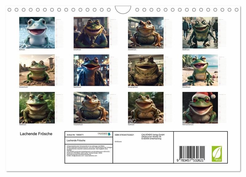 Machen Sie sich bereit, von unseren freundlichen Fröschen verzaubert zu werden! Der brandneue Kalender mit künstlicher Intelligenz erstellten Bildern ist jetzt erhältlich und bietet Ihnen eine unglaubliche visuelle Erfahrung, die Sie in die Welt der Amphibien eintauchen lässt.Jedes Bild in diesem Kalender wurde von einem fortschrittlichen künstlichen Intelligenz-Algorithmus erstellt und zeigt freundlich lächelnde Frösche in verschiedenen Umgebungen. Diese Bilder werden Sie verzaubern und zum Lachen bringen, da jeder Frosch sein eigenes einzigartiges Aussehen und Charisma hat. Von exotischen…mehr