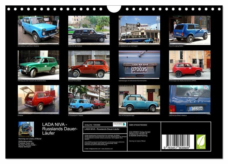 QUALITÄT - Hochwertiger Fotokalender mit 12 wunderschönen Motiven auf lichtbeständigem Bilderdruckpapier, robuste Spiralbindung mit Aufhängebügel.NACHHALTIG - deutliche Abfallreduzierung durch bedarfsgerechte Einzelstückfertigung, umweltfreundliches FSC-zertifiziertes Papier, Produktion in Deutschland, klimabewusste Logistik.PERFEKTES GESCHENK - Kalender für Freunde und Familie, für Kinder und Erwachsene, jung und alt, zu Weihnachten, Geburtstag oder zwischendurch.VIELFALT - Bildkalender in verschiedenen Formaten, z.B. DIN A5, DIN A4, DIN A3 sowie DIN A2. Ob Naturmotiv, Gemälde oder Fotos, ideal für ein persönliches Wohlfühlambiente.Der russische Geländewagen LADA NIVA in Kuba von Autor(in): Henning von Loewis of Menar
