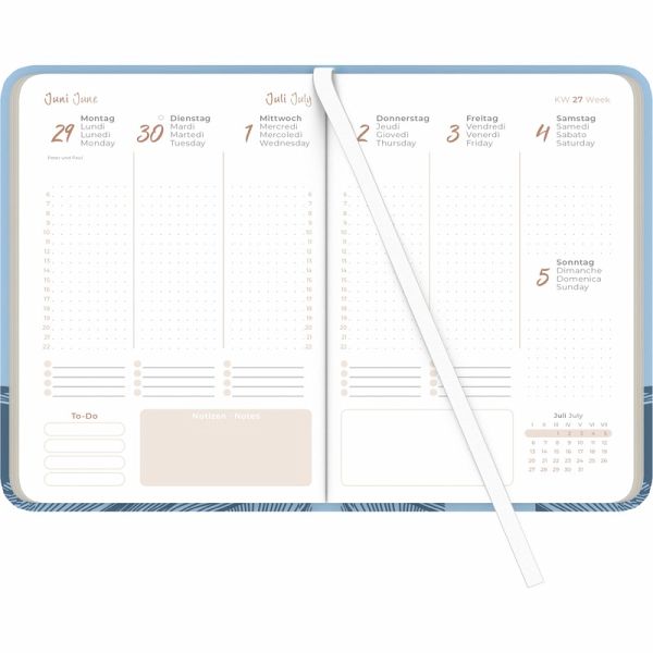 Format: A6 (11×15 cm) handlich & kompakt für die TascheEdler Einband: Weicher, lederähnlicher Tucson-Einband mit feiner MotivprägungÜbersichtliche Planung: 1 Woche pro Doppelseite, Zeiteinteilung 06:00 22:00 Uhr + Notizbereich4-sprachiges Kalendarium: DE/FR/IT/GB mit Feiertagen für DE/AT/CH/FR/ITPlanungshilfen: Jahresübersichten 2026, Monatsübersichten Jan. 2026 Dez. 2027, Bucket List, Habit-TrackerNützliche Extras: Tageszähler, Steuertermine, Pollenflugkalender, Adress- & NotizseitenNachhaltig produziert: FSC-zertifiziertes Papier, Druck mit umweltfreundlichen SojafarbenKomfort-Details: Leseband & fein gerundete Ecken