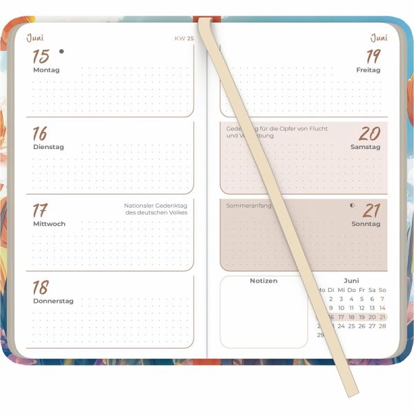 Handlich & kompakt: Format 9×16 cm ideal für unterwegs Übersichtliche Wochenplanung: 1 Kalenderwoche pro Doppelseite mit Platz für kurze Notizen Nachhaltige Qualität: FSC-zertifiziert & mit umweltfreundlichen Sojafarben gedruckt Praktische Inhalte: Jahresübersichten 2026/2027, Monatsübersichten Jan. Dez. 2026, Ferienübersicht DE/AT/CH Zusatznutzen: Info- und Adressteil sowie zahlreiche nützliche Informationen Hochwertige Ausstattung: Robuster, matter Einband im zarten Blütenmeer-Design, Leseband, fein gerundete Ecken