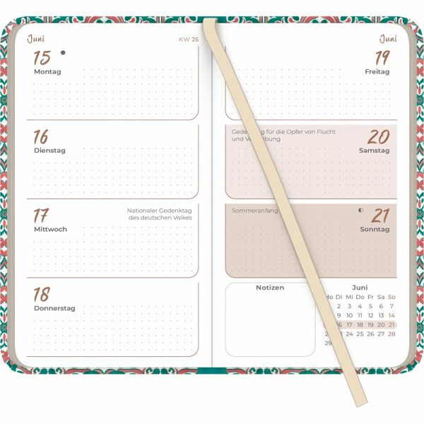 Kompaktes Format: 9×16 cm perfekt für unterwegs Übersichtliche Wochenplanung: 1 Woche pro Doppelseite mit Platz für kurze Notizen Nachhaltige Produktion: FSC-zertifiziert & mit umweltfreundlichen Sojafarben bedruckt Nützliche Inhalte: Jahresübersichten 2026/2027, Monatsübersichten Jan. Dez. 2026, Ferienübersicht DE/AT/CH Praktischer Zusatznutzen: Info- und Adressteil, zahlreiche Zusatzinformationen Hochwertige Ausstattung: Robuster, matter Einband im orientalischen Design, Leseband, fein gerundete Ecken