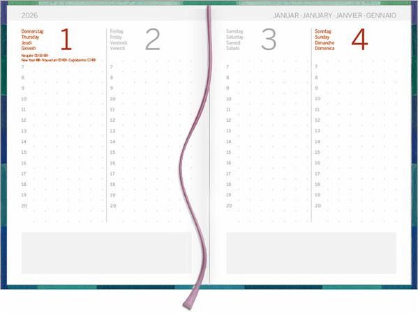 Taschenkalender im Format: 10,5 x 14,8 cm, 240 Seiten, umweltfreundliches FSC PapierPraktische Wochenübersicht: Jede Kalenderwoche übersichtlich auf 4 Seiten!Kalendarium auf D/E/F/I; Feiertage für Deutschland, Österreich und SchweizStabiler Einband in Leinen-OptikPraktisches Lesebändchen; Anzeige der Mondphasen