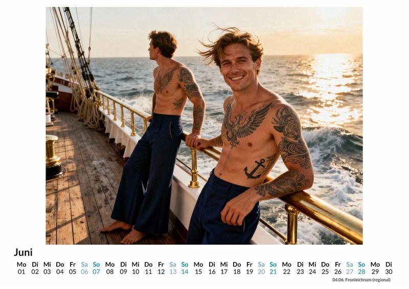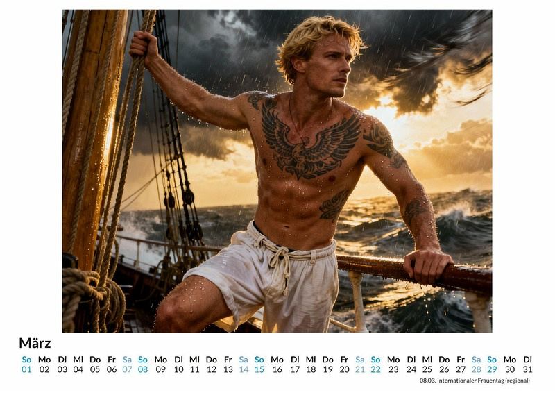 Einleitung Die salzige Luft des Ozeans, das Rauschen der Wellen und der Ruf der Freiheit. Der Kalender "Lässige Matrosen" fängt diese ungebundene Atmosphäre ein und präsentiert zwölf Motive von Männern, die das Meer im Blut haben. Vor der Kulisse des weiten Horizonts entsteht eine Komposition aus Stärke, Lässigkeit und dem Geist des Abenteuers. Für wen ist dieser Kalender geeignet? Für Liebhaber des maritimen Flairs und der Seefahrt. Für Betrachter, die eine Vorliebe für tätowierte Körper und eine natürliche Ästhetik haben. Für alle, die einen unkonventionellen und ausdrucksstarken Wandschmuck suchen. Was diesen Kalender auszeichnet Jeder Monat präsentiert einen anderen Charakter an der Reling eines Schiffes. Gekleidet nur in die klassische Matrosenhose, erzählen die Tattoos auf ihrer Haut Geschichten von fernen Häfen und wilden Meeren. Diese Szenen wurden durch die Kraft digitaler Schöpfungsprozesse zum Leben erweckt und fangen eine idealisierte Vision des Seemannslebens ein. Die fotorealistische Darstellung verbindet Nostalgie mit einem modernen Blick auf das Thema. Was der Kalender bietet Zwölf Monatsmotive mit lässigen Matrosen. Ein praktisches Kalendarium für die Jahresplanung. Ein Wandkalender, der das ganze Jahr über einen Hauch von Abenteuer versprüht. Zusammenfassung Der Kalender "Lässige Matrosen" ist eine Hommage an die Freiheit und die raue Schönheit des Meeres, interpretiert in zwölf einzigartigen Bildern. Eine Einladung, sich Monat für Monat von dieser besonderen Stimmung begleiten zu lassen.