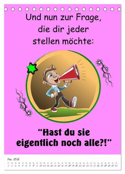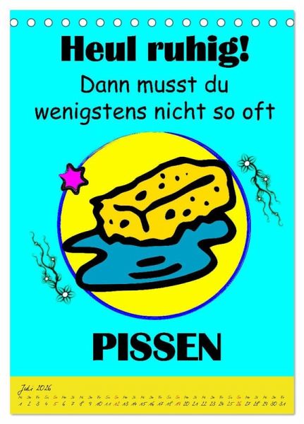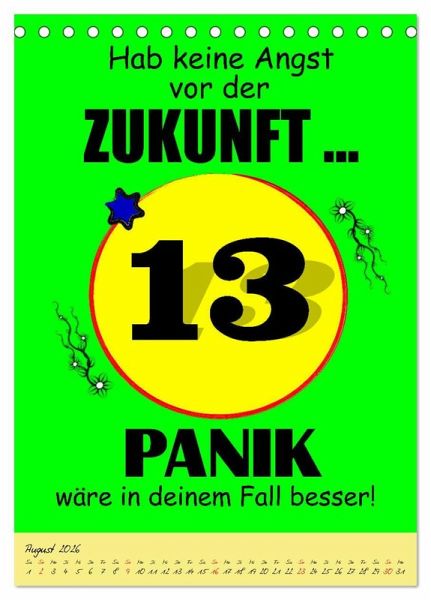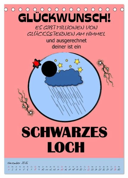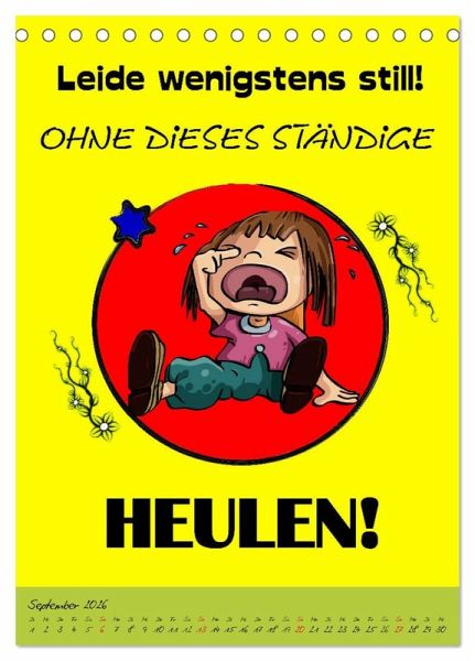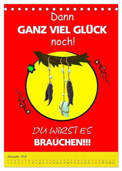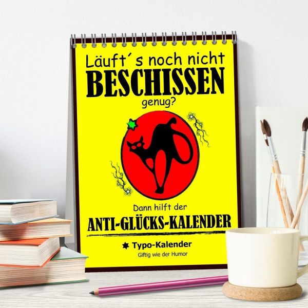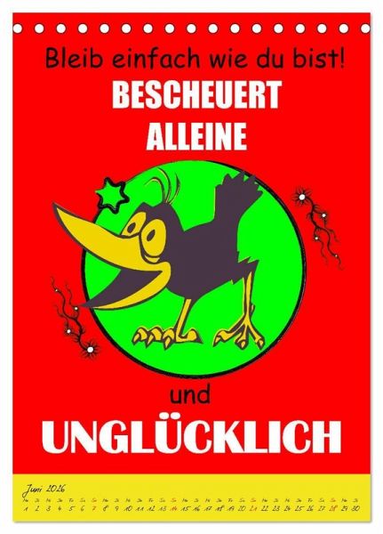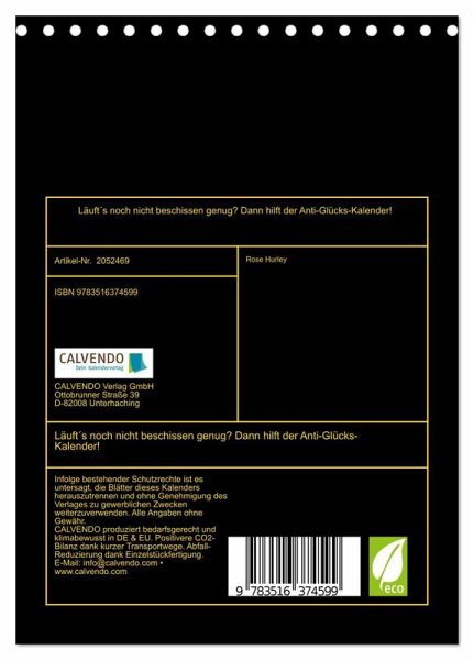 Ein Kalender der alles hat was man so braucht, um sein unglückliches Dasein auch so richtig zu feiern. Gemeine Sprüche und schräge Zukunftsperspektiven sind ein geiler Spaß, der für fassungslose Gesichter und lautes Gelächter sorgen wird. Eine coole Geschenksidee für Heulsusen, Schwarzseher, Pessimisten und Menschen mit Sinn für Sarkasmus und derben, schwarzen Humor.