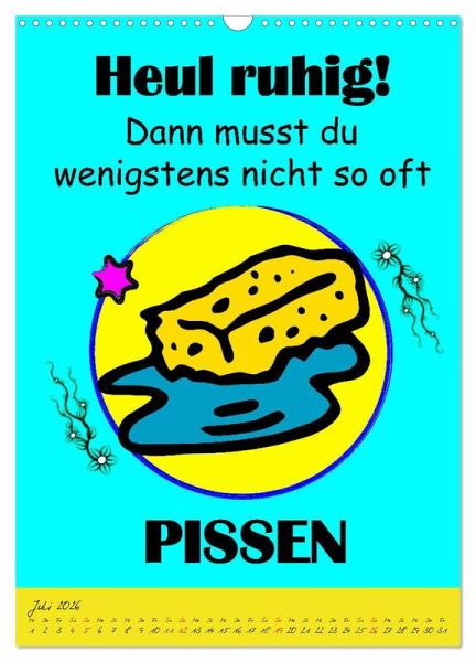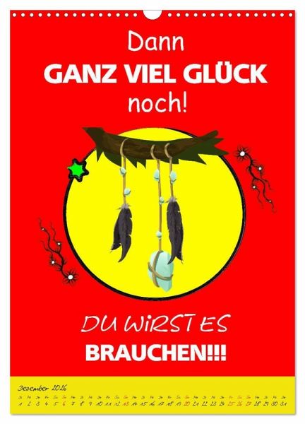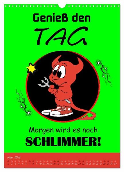 Ein Kalender der alles hat was man so braucht, um sein unglückliches Dasein auch so richtig zu feiern. Gemeine Sprüche und schräge Zukunftsperspektiven sind ein geiler Spaß, der für fassungslose Gesichter und lautes Gelächter sorgen wird. Eine coole Geschenksidee für Heulsusen, Schwarzseher, Pessimisten und Menschen mit Sinn für Sarkasmus und derben, schwarzen Humor.