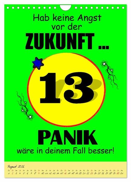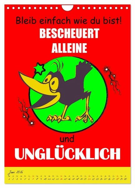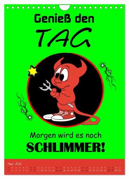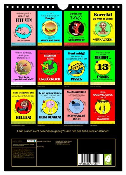 Ein Kalender der alles hat was man so braucht, um sein unglückliches Dasein auch so richtig zu feiern. Gemeine Sprüche und schräge Zukunftsperspektiven sind ein geiler Spaß, der für fassungslose Gesichter und lautes Gelächter sorgen wird. Eine coole Geschenksidee für Heulsusen, Schwarzseher, Pessimisten und Menschen mit Sinn für Sarkasmus und derben, schwarzen Humor.