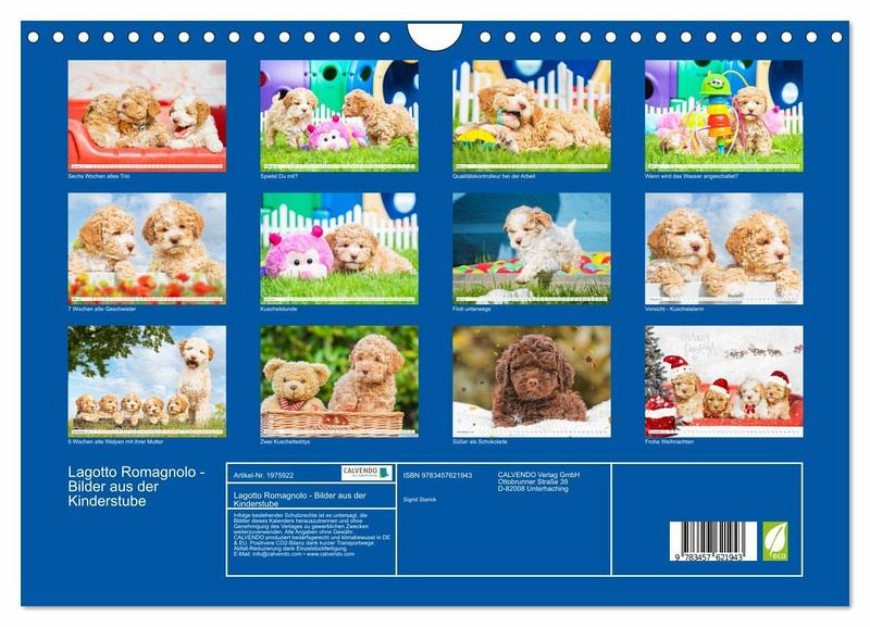 QUALITÄT - Hochwertiger Fotokalender mit 12 wunderschönen Motiven auf lichtbeständigem Bilderdruckpapier, robuste Spiralbindung mit Aufhängebügel.NACHHALTIG - deutliche Abfallreduzierung durch bedarfsgerechte Einzelstückfertigung, umweltfreundliches FSC-zertifiziertes Papier, Produktion in Deutschland, klimabewusste Logistik.PERFEKTES GESCHENK - Kalender für Freunde und Familie, für Kinder und Erwachsene, jung und alt, zu Weihnachten, Geburtstag oder zwischendurch.VIELFALT - Bildkalender in verschiedenen Formaten, z.B.DIN A5, DIN A4, DIN A3 sowie DIN A2. Ob Naturmotiv, Gemälde oder Fotos, ideal für ein persönliches Wohlfühlambiente.13 entzückende Fotos von Lagotto-Welpen begleiten Liebhaber der Rasse durch das Jahr von Autor(in): SiSta-Tierfoto