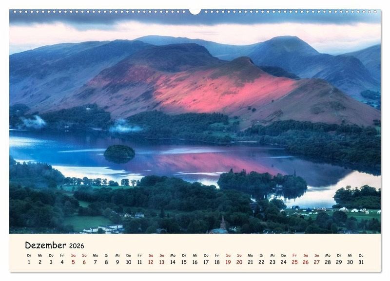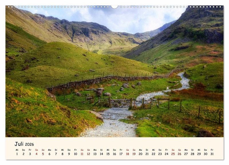 Der Nationalpark Lake District in Cumbria, England bietet malerische Seen und Bergen. Es gibt Steilfelsen, Schluchten, Abgründe und zahlreiche Gipfel. Dieser Fotokalender führt Sie durch grüne Landschaften und raue Täler.