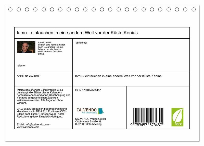 QUALITÄT - Hochwertiger Fotokalender mit 12 wunderschönen Motiven auf lichtbeständigem Bilderdruckpapier, robuste Spiralbindung.NACHHALTIG - deutliche Abfallreduzierung durch bedarfsgerechte Einzelstückfertigung, umweltfreundliches FSC-zertifiziertes Papier, Produktion in Deutschland, klimabewusste Logistik.PERFEKTES GESCHENK - Kalender für Freunde und Familie, für Kinder und Erwachsene, jung und alt, zu Weihnachten, Geburtstag oder zwischendurch.VIELFALT - Bildkalender in verschiedenen Formaten, z.B. DIN A5, DIN A4, DIN A3 sowie DIN A2. Ob Naturmotiv, Gemälde oder Fotos, ideal für ein persönliches Wohlfühlambiente.Der Eindruck, eine andere Welt zu betreten ist auf Lamu unmittelbar. von Autor(in): rsiemer