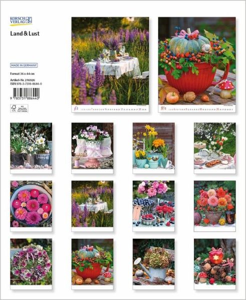 Romantisch, charmant und unbeschwert, dazu ökologisch und gesund, das sind die Eigenschaften, die die meisten Menschen mit dem Landleben verbinden. Unser Kalender zeigt wundervolle Stillleben aus ländlichen Idyllen und passt perfekt zum trendigen Shabby-Chic, Landhausstil und nostalgischen Einrichtungen.