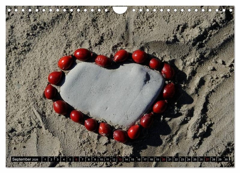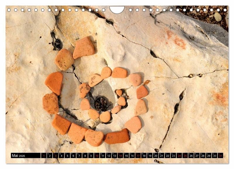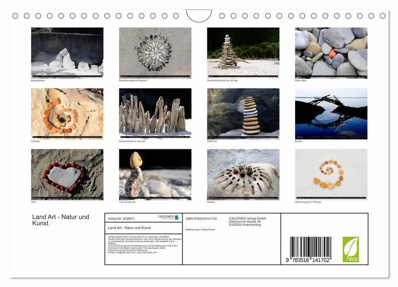 Der Kalender zeigt kleine Kunstwerke aus der unscheinbaren Natur. Steine, Stöcke, Samen, Früchte oder Blätter werden zu sichtbaren Kunstwerken und lenken den Fokus auf die meist unsichtbare Schönheit der Schöpfung.