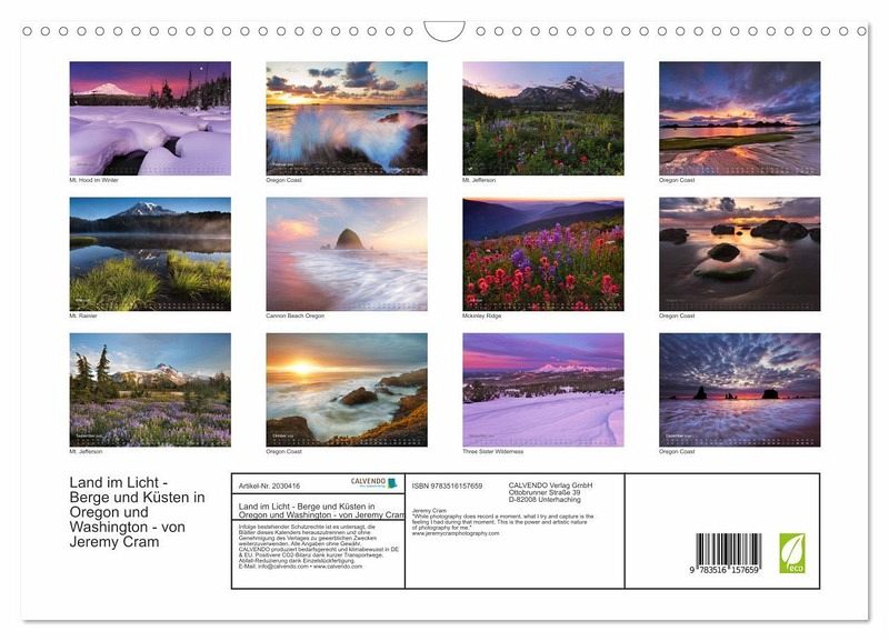 QUALITÄT - Hochwertiger Fotokalender mit 12 wunderschönen Motiven auf lichtbeständigem Bilderdruckpapier, robuste Spiralbindung mit Aufhängebügel.NACHHALTIG - deutliche Abfallreduzierung durch bedarfsgerechte Einzelstückfertigung, umweltfreundliches FSC-zertifiziertes Papier, Produktion in Deutschland, klimabewusste Logistik.PERFEKTES GESCHENK - Kalender für Freunde und Familie, für Kinder und Erwachsene, jung und alt, zu Weihnachten, Geburtstag oder zwischendurch.VIELFALT - Bildkalender in verschiedenen Formaten, z.B. DIN A5, DIN A4, DIN A3 sowie DIN A2. Ob Naturmotiv, Gemälde oder Fotos, ideal für ein persönliches Wohlfühlambiente.Stimmungsvolle Fotos von Bergen und Küsten in den USA - in Oregon und Washington von Autor(in): Jeremy Cram