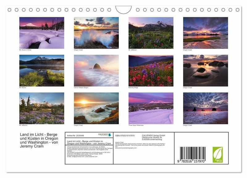 QUALITÄT - Hochwertiger Fotokalender mit 12 wunderschönen Motiven auf lichtbeständigem Bilderdruckpapier, robuste Spiralbindung mit Aufhängebügel.NACHHALTIG - deutliche Abfallreduzierung durch bedarfsgerechte Einzelstückfertigung, umweltfreundliches FSC-zertifiziertes Papier, Produktion in Deutschland, klimabewusste Logistik.PERFEKTES GESCHENK - Kalender für Freunde und Familie, für Kinder und Erwachsene, jung und alt, zu Weihnachten, Geburtstag oder zwischendurch.VIELFALT - Bildkalender in verschiedenen Formaten, z.B. DIN A5, DIN A4, DIN A3 sowie DIN A2. Ob Naturmotiv, Gemälde oder Fotos, ideal für ein persönliches Wohlfühlambiente.Stimmungsvolle Fotos von Bergen und Küsten in den USA - in Oregon und Washington von Autor(in): Jeremy Cram
