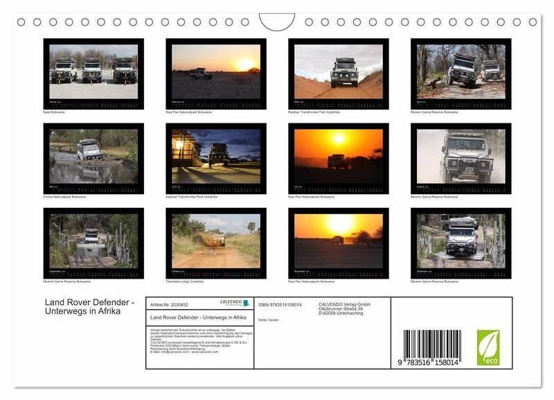 QUALITÄT - Hochwertiger Fotokalender mit 12 wunderschönen Motiven auf lichtbeständigem Bilderdruckpapier, robuste Spiralbindung mit Aufhängebügel.NACHHALTIG - deutliche Abfallreduzierung durch bedarfsgerechte Einzelstückfertigung, umweltfreundliches FSC-zertifiziertes Papier, Produktion in Deutschland, klimabewusste Logistik.PERFEKTES GESCHENK - Kalender für Freunde und Familie, für Kinder und Erwachsene, jung und alt, zu Weihnachten, Geburtstag oder zwischendurch.VIELFALT - Bildkalender in verschiedenen Formaten, z.B. DIN A5, DIN A4, DIN A3 sowie DIN A2. Ob Naturmotiv, Gemälde oder Fotos, ideal für ein persönliches Wohlfühlambiente.4x4 in Afrika, der Defender im afrikanischen Busch von Autor(in): Stefan Sander