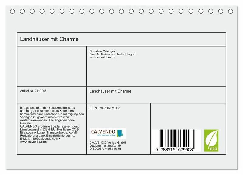 Der Kalender "Landhäuser mit Charme" präsentiert Ihnen mit faszinierenden Fotos des Reise- und Naturfotografen Christian Müringer wunderschöne, romantische Cottages und Landhäuser aus Bayern, der Deutschen Ostseeküste, Südtirol, Frankreich, Dänemark, England, Dänemark und Schweden.
