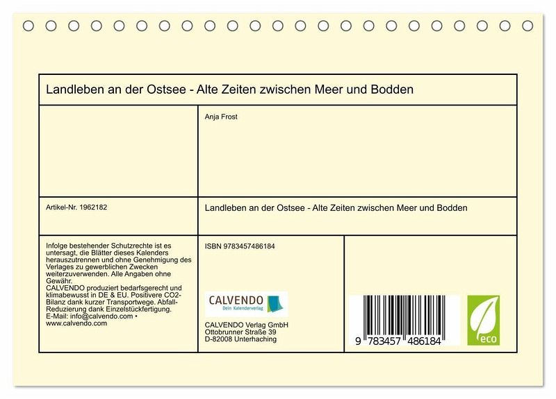 QUALITÄT - Hochwertiger Fotokalender mit 12 wunderschönen Motiven auf lichtbeständigem Bilderdruckpapier, robuste Spiralbindung.NACHHALTIG - deutliche Abfallreduzierung durch bedarfsgerechte Einzelstückfertigung, umweltfreundliches FSC-zertifiziertes Papier, Produktion in Deutschland, klimabewusste Logistik.PERFEKTES GESCHENK - Kalender für Freunde und Familie, für Kinder und Erwachsene, jung und alt, zu Weihnachten, Geburtstag oder zwischendurch.VIELFALT - Bildkalender in verschiedenen Formaten, z.B. DIN A5, DIN A4, DIN A3 sowie DIN A2. Ob Naturmotiv, Gemälde oder Fotos, ideal für ein persönliches Wohlfühlambiente.Die Schönheit des Landlebens als Zeitreise an der Ostsee von Autor(in): Anja Frost