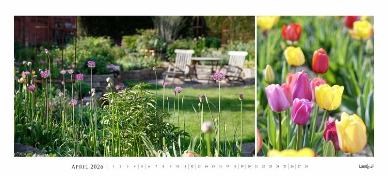 Klare Monatsdarstellungen, hervorgehobene Feiertage und praktischer Notizraum, alles harmonisch in die Gartenfotografie integriert.