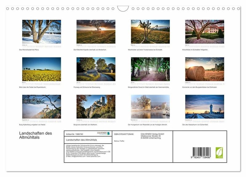 QUALITÄT - Hochwertiger Fotokalender mit 12 wunderschönen Motiven auf lichtbeständigem Bilderdruckpapier, robuste Spiralbindung mit Aufhängebügel.NACHHALTIG - deutliche Abfallreduzierung durch bedarfsgerechte Einzelstückfertigung, umweltfreundliches FSC-zertifiziertes Papier, Produktion in Deutschland, klimabewusste Logistik.PERFEKTES GESCHENK - Kalender für Freunde und Familie, für Kinder und Erwachsene, jung und alt, zu Weihnachten, Geburtstag oder zwischendurch.VIELFALT - Bildkalender in verschiedenen Formaten, z.B. DIN A5, DIN A4, DIN A3 sowie DIN A2. Ob Naturmotiv, Gemälde oder Fotos, ideal für ein persönliches Wohlfühlambiente.Landschaften, die das Altmühltal umgeben, im Verlauf der Jahreszeiten. von Autor(in): Markus Treffer