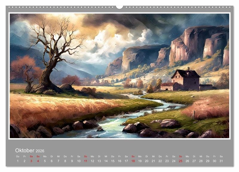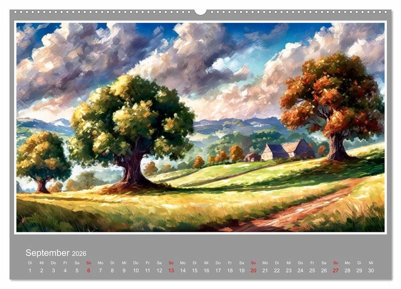 Unser Bildkalender, der mithilfe von künstlicher Intelligenz erstellt wurde, präsentiert ansprechende Landschaftsansichten, die wie gemalt erscheinen. Jeder Monat enthüllt ein neues Kunstwerk, das die aktuelle Jahreszeit in der Natur auf eindrucksvolle Weise abbildet. Genießen Sie Monat für Monat die Schönheit und Faszination dieser beeindruckenden Meisterwerke. Vielleicht steckt die Zukunft der Kunst in unserem innovativen Bildkalender und Sie können heute schon mit dieser Zukunft die Wand ihres Heims schmücken.