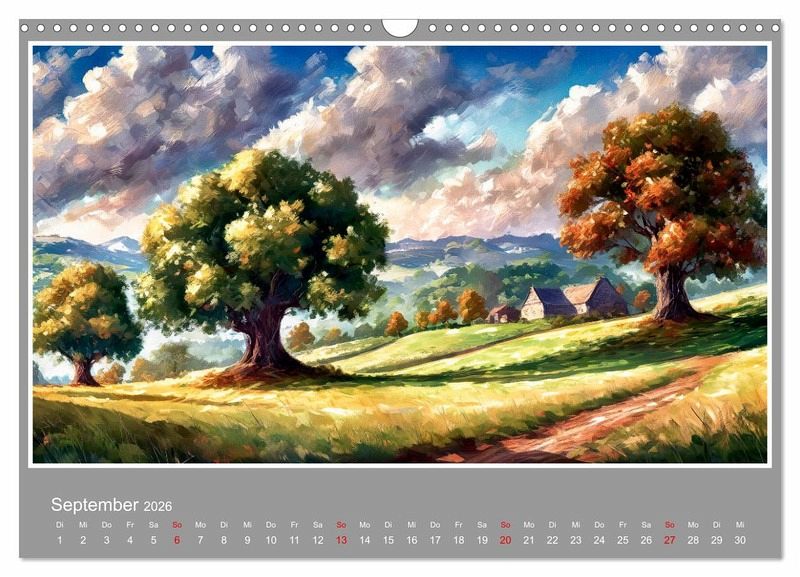 Unser Bildkalender, der mithilfe von künstlicher Intelligenz erstellt wurde, präsentiert ansprechende Landschaftsansichten, die wie gemalt erscheinen. Jeder Monat enthüllt ein neues Kunstwerk, das die aktuelle Jahreszeit in der Natur auf eindrucksvolle Weise abbildet. Genießen Sie Monat für Monat die Schönheit und Faszination dieser beeindruckenden Meisterwerke. Vielleicht steckt die Zukunft der Kunst in unserem innovativen Bildkalender und Sie können heute schon mit dieser Zukunft die Wand ihres Heims schmücken.