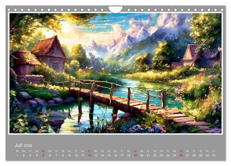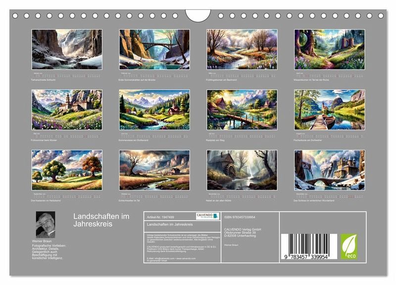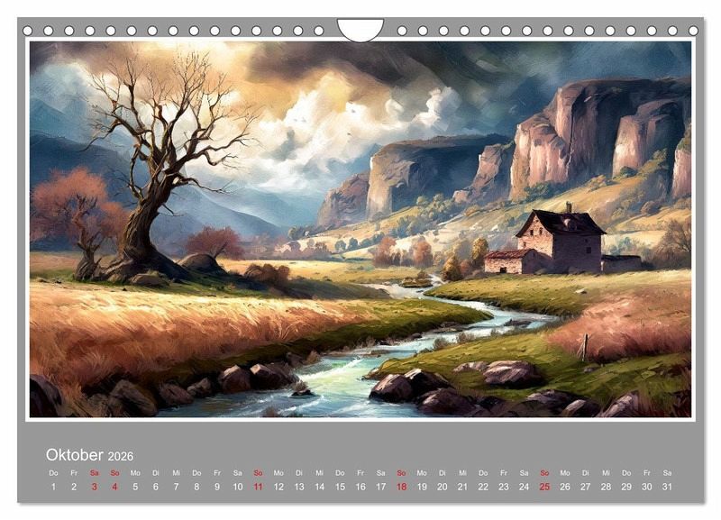 Unser Bildkalender, der mithilfe von künstlicher Intelligenz erstellt wurde, präsentiert ansprechende Landschaftsansichten, die wie gemalt erscheinen. Jeder Monat enthüllt ein neues Kunstwerk, das die aktuelle Jahreszeit in der Natur auf eindrucksvolle Weise abbildet. Genießen Sie Monat für Monat die Schönheit und Faszination dieser beeindruckenden Meisterwerke. Vielleicht steckt die Zukunft der Kunst in unserem innovativen Bildkalender und Sie können heute schon mit dieser Zukunft die Wand ihres Heims schmücken.