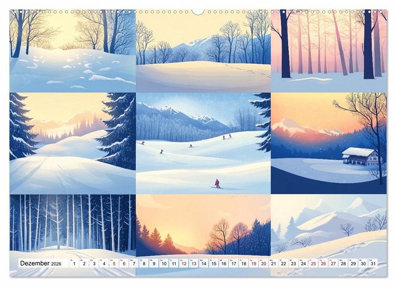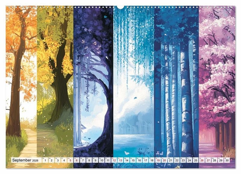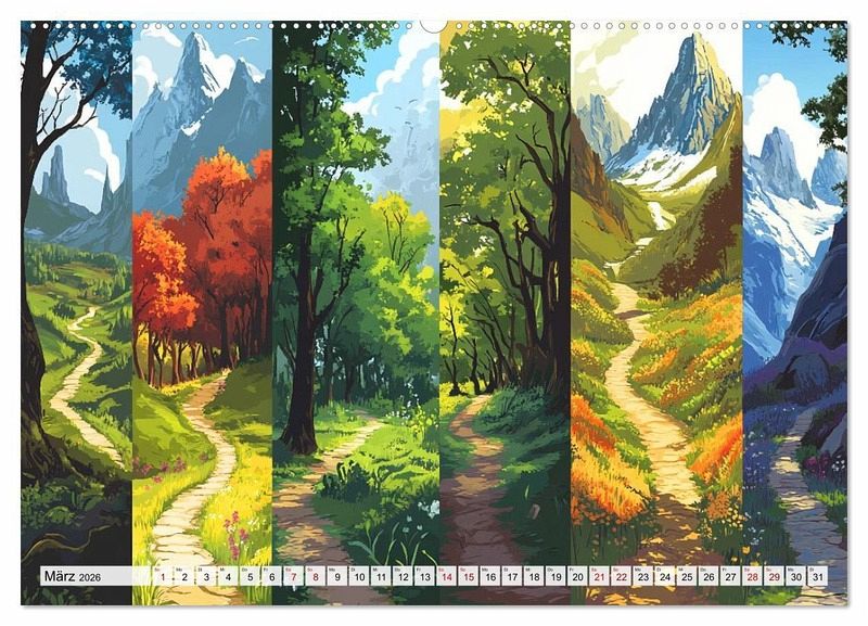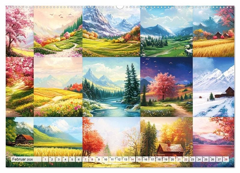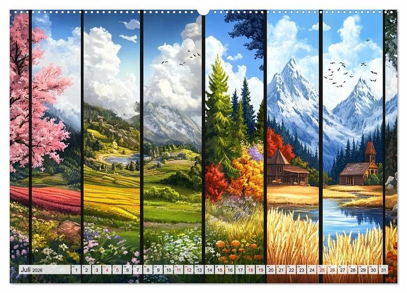 In jedem Monat entfaltet sich die Natur in kunstvoll angeordneten Streifen und Vierecken - komponiert aus KI-generierten Landschaftsbildern. Die künstliche Intelligenz erschafft detailreiche Szenen, die in Fragmenten eine ganz eigene Ästhetik entfalten. Eine faszinierende Mischung aus digitaler Kreativität und natürlicher Schönheit - für alle, die das Besondere suchen.
