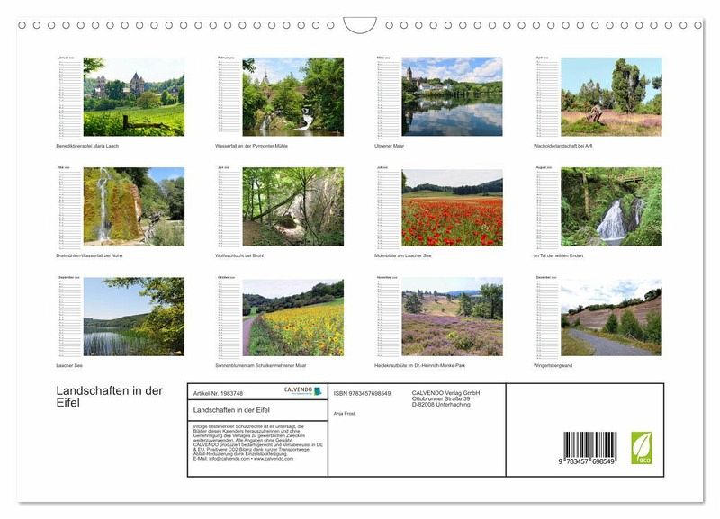 QUALITÄT - Hochwertiger Fotokalender mit 12 wunderschönen Motiven auf lichtbeständigem Bilderdruckpapier, robuste Spiralbindung mit Aufhängebügel.NACHHALTIG - deutliche Abfallreduzierung durch bedarfsgerechte Einzelstückfertigung, umweltfreundliches FSC-zertifiziertes Papier, Produktion in Deutschland, klimabewusste Logistik.PERFEKTES GESCHENK - Kalender für Freunde und Familie, für Kinder und Erwachsene, jung und alt, zu Weihnachten, Geburtstag oder zwischendurch.VIELFALT - Bildkalender in verschiedenen Formaten, z.B. DIN A5, DIN A4, DIN A3 sowie DIN A2. Ob Naturmotiv, Gemälde oder Fotos, ideal für ein persönliches Wohlfühlambiente.Eifel und ihre Landschaften mit vulkanischem Ursprung von Autor(in): Anja Frost