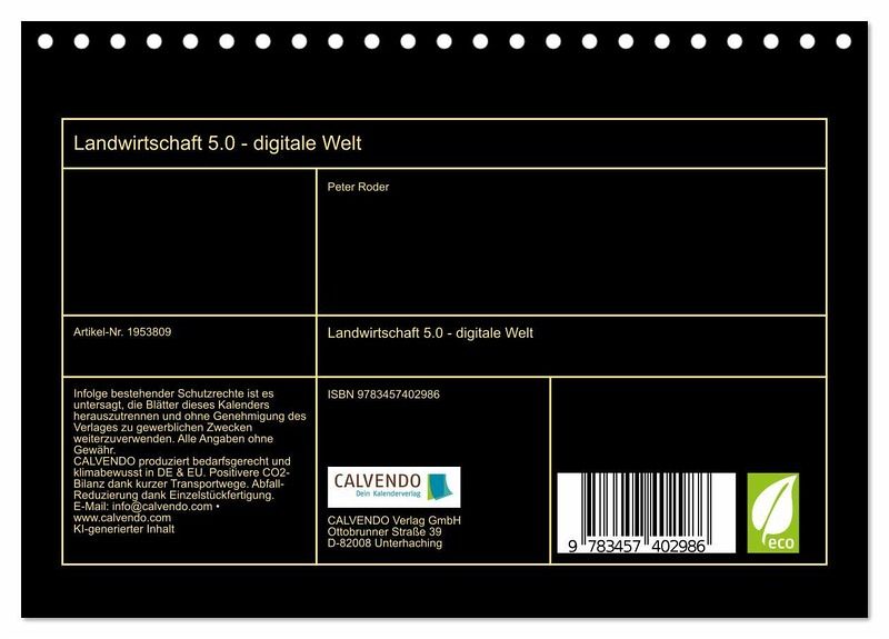 Erleben Sie die Zukunft der Landwirtschaft mit diesem High-Tech-Landmaschinen-Kalender. Traktoren und Mähdrescher in Aktion bei vielfältigen Aufgaben - von der Aussaat bis zur Ernte. Tauchen Sie ein in erfasste Parameter und Daten, hier wird die Präzision und Kraft moderner Landwirtschaftstechnologie präsentiert. Der Fotokünstler Peter Roder hat fantastische KI-Bilder gestaltet und zusammengestellt. Ein Muss für alle die sich für digitale Technologie begeistern.