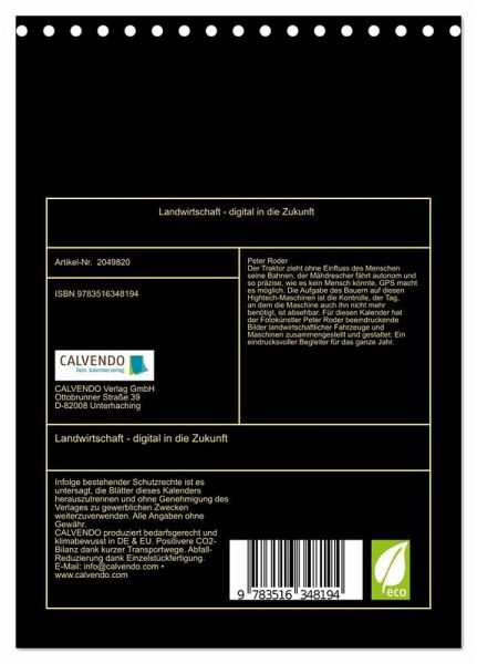 QUALITÄT - Hochwertiger Fotokalender mit 12 wunderschönen Motiven auf lichtbeständigem Bilderdruckpapier, robuste Spiralbindung.NACHHALTIG - deutliche Abfallreduzierung durch bedarfsgerechte Einzelstückfertigung, umweltfreundliches FSC-zertifiziertes Papier, Produktion in Deutschland, klimabewusste Logistik.PERFEKTES GESCHENK - Kalender für Freunde und Familie, für Kinder und Erwachsene, jung und alt, zu Weihnachten, Geburtstag oder zwischendurch.VIELFALT - Bildkalender in verschiedenen Formaten, z.B. DIN A5, DIN A4, DIN A3 sowie DIN A2. Ob Naturmotiv, Gemälde oder Fotos, ideal für ein persönliches Wohlfühlambiente.Hightech in landwirtschaftlichen Maschinen. von Autor(in): Peter Roder