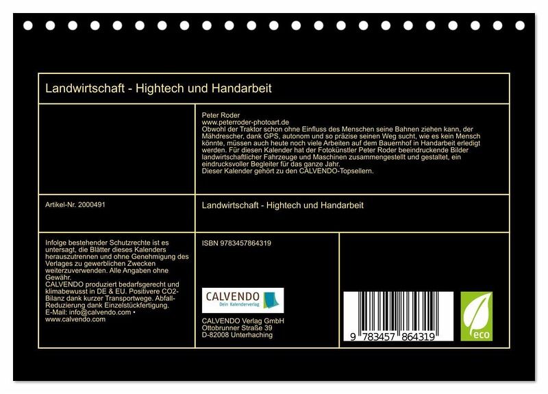 Obwohl der Traktor schon ohne Einfluss des Menschen seine Bahnen ziehen kann, der Mähdrescher, dank GPS, autonom und so präzise seinen Weg sucht, wie es kein Mensch könnte, müssen auch heute noch viele Arbeiten auf dem Bauernhof in Handarbeit erledigt werden. Für diesen Kalender hat der Fotokünstler Peter Roder beeindruckende Bilder landwirtschaftlicher Fahrzeuge und Maschinen zusammengestellt und gestaltet, ein eindrucksvoller Begleiter für das ganze Jahr.