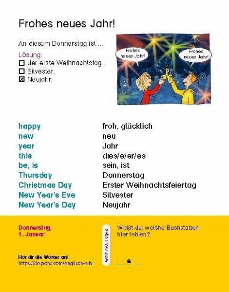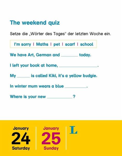 Jeden Tag ein Häppchen Englisch Toll für Kinder ab 6 JahrenÜbungen, die Spaß machen, Rätsel, Reime und WitzeÜbersetzungen und Lösungen auf der RückseiteWort des Tages und Wochenendquiz zur Wiederholung