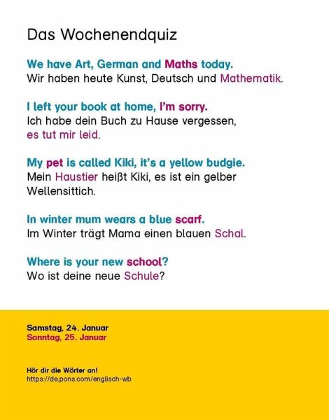 Toll für Kinder ab 6 JahrenÜbungen, die Spaß machen, Rätsel, Reime und WitzeÜbersetzungen und Lösungen auf der RückseiteWort des Tages und Wochenendquiz zur Wiederholung