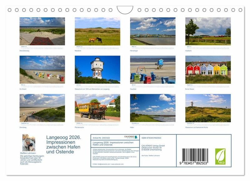 Langeoog gehört zu den Ostfriesischen Inseln. Die autofreie Familieninsel überzeugt durch Ruhe und Natur, weite Strände und hohe Dünen sowie Schönheit zwischen Wellen und Watt. Die schönsten Seiten der Insel hat die Hamburger Fotokünstlerin Steffani Lehmann für diesen Kalender eingefangen.