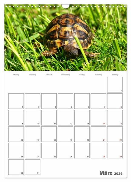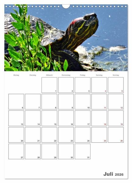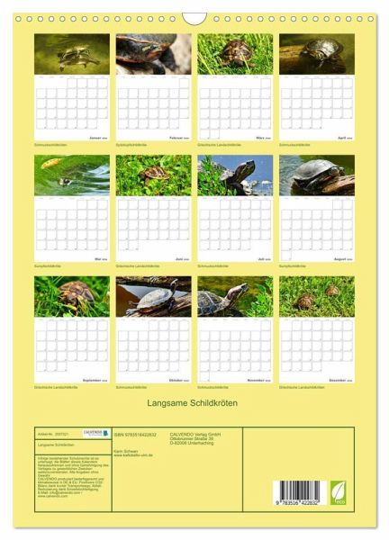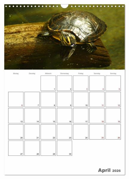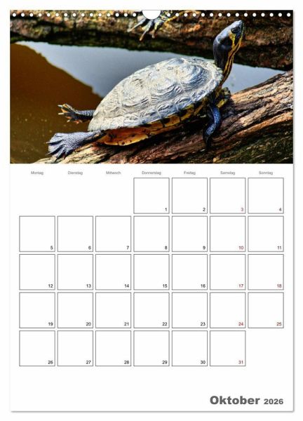 Schildkröten gehören zu Gruppe der Reptilien. Sie können sehr alt werden und es kommt sogar vor, dass sie ihren Besitzer überleben. Es gibt zahlreiche Schildkrötenarten, die entweder im Wasser oder auf dem Land leben. Dieser Kalender soll Ihnen diese einzigartigen Reptilien näher bringen und Sie an alle wichtigen Termine erinnern.