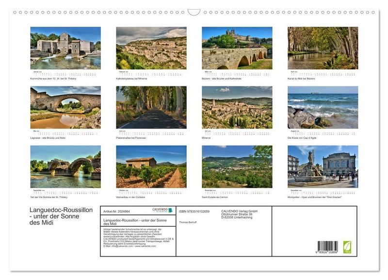 QUALITÄT - Hochwertiger Fotokalender mit 12 wunderschönen Motiven auf lichtbeständigem Bilderdruckpapier, robuste Spiralbindung mit Aufhängebügel.NACHHALTIG - deutliche Abfallreduzierung durch bedarfsgerechte Einzelstückfertigung, umweltfreundliches FSC-zertifiziertes Papier, Produktion in Deutschland, klimabewusste Logistik.PERFEKTES GESCHENK - Kalender für Freunde und Familie, für Kinder und Erwachsene, jung und alt, zu Weihnachten, Geburtstag oder zwischendurch.VIELFALT - Bildkalender in verschiedenen Formaten, z.B. DIN A5, DIN A4, DIN A3 sowie DIN A2. Ob Naturmotiv, Gemälde oder Fotos, ideal für ein persönliches Wohlfühlambiente.Städte, Dörfer und historische Monumente im Languedoc-Roussillon. Jeden Monat eine neue Impression dieser herrlichen Landschaft. von Autor(in): Thomas Bartruff