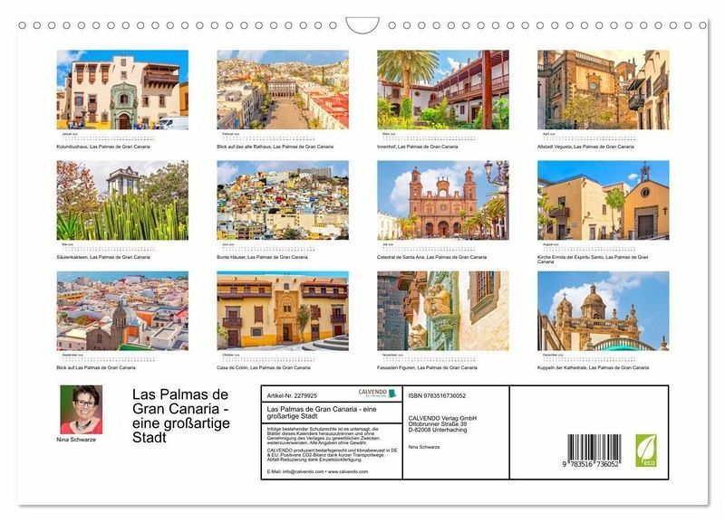 Dieser Kalender macht Lust auf das nächste faszinierende Reiseziel - Las Palmas de Gran Canaria. Begeben Sie sich mit auf eine spannende Fotoreise durch die historische Altstadt voller Geschichte, hier ging schon Kolumbus an Land. Der Stadtteil Vegueta gehört zum UNESCO-Weltkulturerbe. Lassen Sie sich inspirieren.