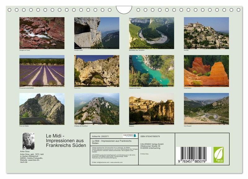 QUALITÄT - Hochwertiger Fotokalender mit 12 wunderschönen Motiven auf lichtbeständigem Bilderdruckpapier, robuste Spiralbindung mit Aufhängebügel.NACHHALTIG - deutliche Abfallreduzierung durch bedarfsgerechte Einzelstückfertigung, umweltfreundliches FSC-zertifiziertes Papier, Produktion in Deutschland, klimabewusste Logistik.PERFEKTES GESCHENK - Kalender für Freunde und Familie, für Kinder und Erwachsene, jung und alt, zu Weihnachten, Geburtstag oder zwischendurch.VIELFALT - Bildkalender in verschiedenen Formaten, z.B. DIN A5, DIN A4, DIN A3 sowie DINA2. Ob Naturmotiv, Gemälde oder Fotos, ideal für ein persönliches Wohlfühlambiente.Wunderschöne Fotos dieser traumhaften Region Frankreichs! von Autor(in): Anke Grau