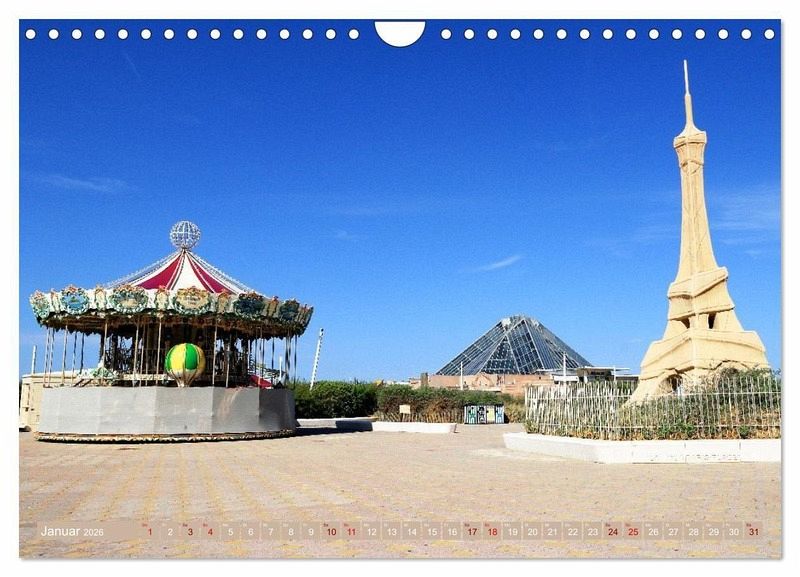 Januar: Drei Wahrzeichen: historisches Karussell, Aqualud, Eiffelturm aus Sand