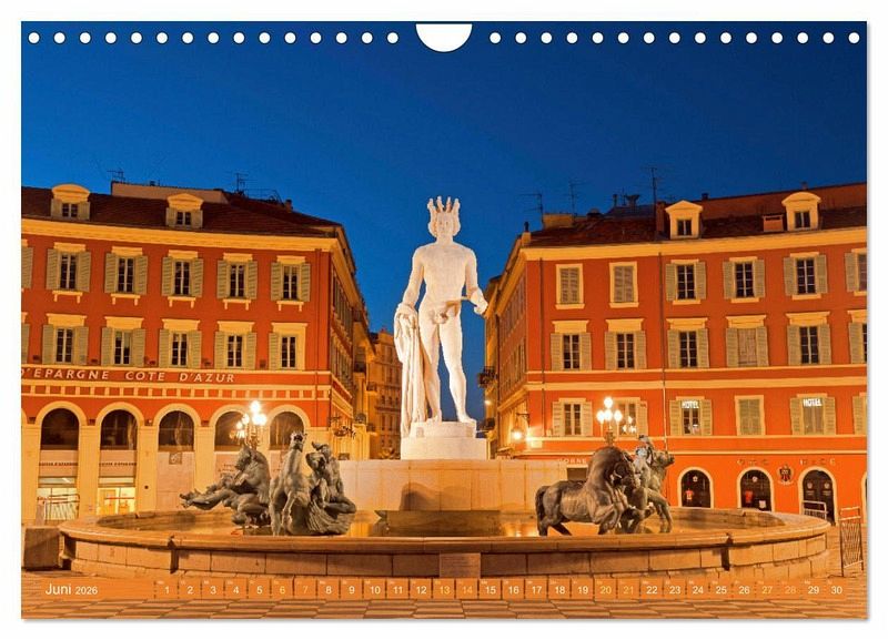 Juni: Apollo-Statue am Fontaine du Soleil in der blauen Stunde, Nizza, Provence-Alpes-Côte d'Azur, Frankreich, Europa