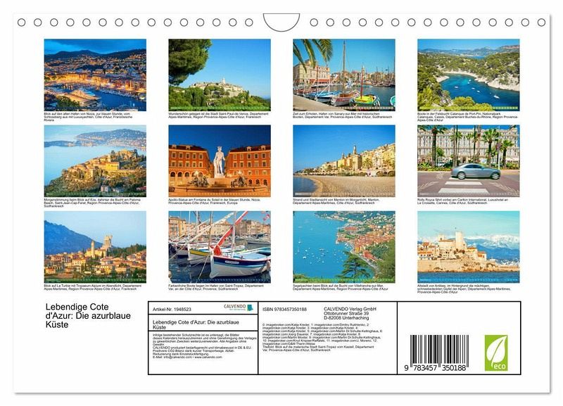 QUALITÄT - Hochwertiger Fotokalender mit 12 wunderschönen Motiven auf lichtbeständigem Bilderdruckpapier, robuste Spiralbindung mit Aufhängebügel.NACHHALTIG - deutliche Abfallreduzierung durch bedarfsgerechte Einzelstückfertigung, umweltfreundliches FSC-zertifiziertes Papier, Produktion in Deutschland, klimabewusste Logistik.PERFEKTES GESCHENK - Kalender für Freunde und Familie, für Kinder und Erwachsene, jung und alt, zu Weihnachten, Geburtstag oder zwischendurch.VIELFALT - Bildkalender in verschiedenen Formaten, z.B. DIN A5, DIN A4, DIN A3 sowie DIN A2. Ob Naturmotiv, Gemälde oder Fotos, ideal für ein persönliches Wohlfühlambiente.Cote d'Azur: Sehnsucht nach Sonne, Strand und Meer von Autor(in): CALVENDO Verlag
