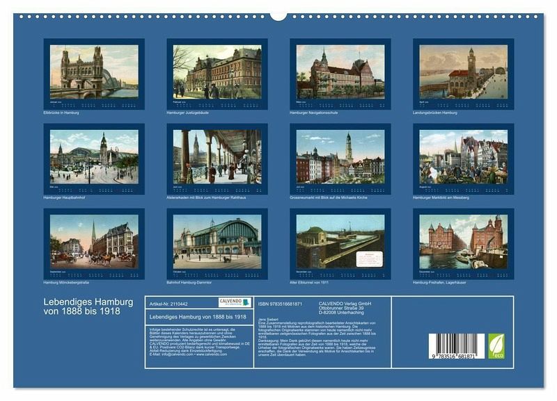 PREMIUM-LINIE - Brillanter Fotokalender mit 12 wunderschönen Motiven, Kunstdruck in Hochglanz in Museumsqualität.QUALITÄT - edle Materialien, stabile Rückwand mit 2 innovativen Einstecktaschen für eine optimale Präsentation an der Wand.NACHHALTIG - deutliche Abfallreduzierung durch bedarfsgerechte Einzelstückfertigung, umweltfreundliches FSC-zertifiziertes Papier, Produktion in Deutschland, klimabewusste Logistik.PERFEKTES GESCHENK - Kalender für Freunde und Familie, für Kinder und Erwachsene, jung und alt, zu Weihnachten, Geburtstag oder zwischendurch.Ein Monats-Kalender mit Reprofotografien antiquarischer Ansichtskarten aus dem historischen Hamburg von 1888 bis 1918. von Autor(in): Jens Siebert