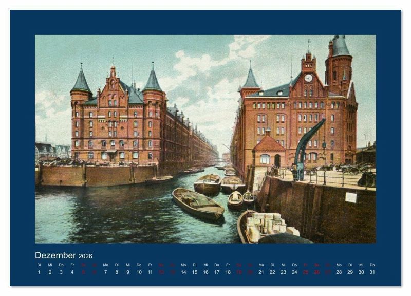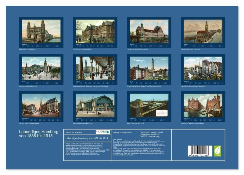 Dieser Kalender enthält eine zusammenstellung reprofotografisch bearbeiteter Ansichtskarten von 1888 bis 1918 mit Motiven aus dem historischen Hamburg. Die fotografischen Originalwerke stammen von heute namentlich nicht mehr ermittelbaren zeitgenössischen Fotografen aus der genannten Zeit. Alle Fotografien wurden von Jens Siebert reprofotografisch dokumentiert, und zum Zwecke der Re-Publikation in zeitgemässer Qualität mit der professionellen Bildbearbeitungs-Software Photoshop-CC restauriert und nachbearbeitet.