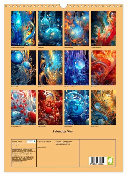 Glas hat eine besondere Faszination. Vor allem in der Kunst der Glasbläserei mit ihren atemberaubenden Formen und der Vielfalt an Farben. Dieser Kalender erinnert mit seinen Bildern an die Kunst der Glasbläser und inspiriert zu meditativer Versenkung in die vielfältigen, organischen Formen. Die Bilder wurden erstellt mit Fantasie, Kreativität, künstlicher Intelligenz und Photoshop.