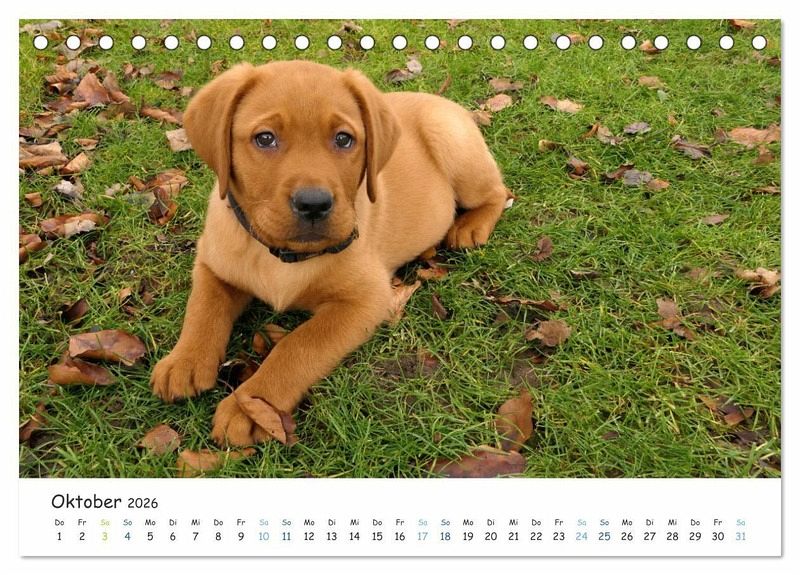 Oktober: Labradorwelpe liegt im Gras zwischen herbstlichen Blättern