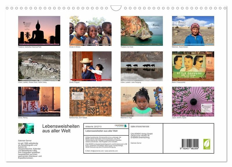 Tauchen Sie ein in die faszinierende Welt der Weisheiten. Jeden Monat erwartet Sie eine neue, tiefgründige Erkenntnis aus verschiedenen Kulturen und Traditionen, die Ihren Alltag mit wertvollen Perspektiven bereichert. Von den beruhigenden Gedanken der asiatischen Zen-Meditationen bis hin zu den kraftvollen Sprichwörtern der afrikanischen Traditionen - dieser Kalender bietet Ihnen eine tägliche Dosis Inspiration und Reflexion. Lassen Sie sich von globalen Weisheiten führen und entdecken Sie die universellen Wahrheiten, die uns alle verbinden. Lassen Sie sich von der Vielfalt menschlicher Gedanken inspirieren. Die passenden Fotografien hat die Reisefotografin Gabriele Gerner auf mehreren Reisen um die Welt für Sie eingefangen. Viel Spaß damit!