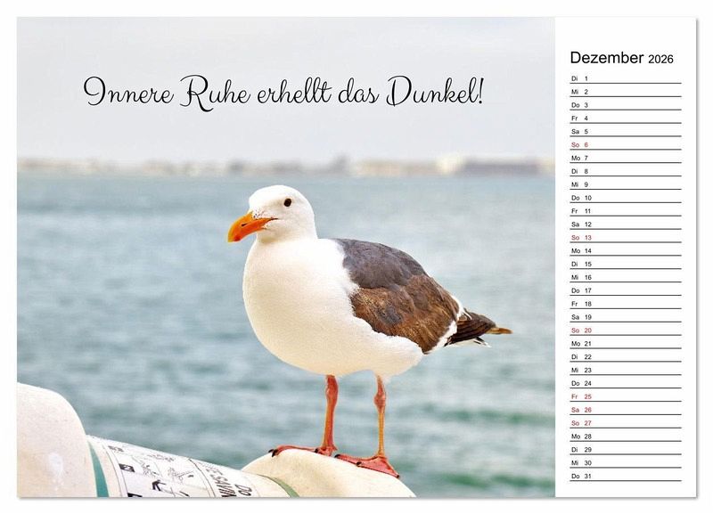 Dieser Motivationskalender und Familienkalender verbindet Möwenfotos mit tiefsinnigen Sprüchen, Zitaten und Lebensweisheiten. Als Spruchkalender für Achtsamkeit, Motivation und innere Ruhe ist er ideal für Zuhause, das Büro oder den stressigen Arbeitsplatz. Mit liebevoll gestalteten Bildern von Möwen und Vögeln lädt der Tierkalender jeden Monat zum Innehalten ein. Ob als Achtsamkeitskalender, Spruchkalender für die Arbeit oder zur persönlichen Motivation - die Kombination aus Tieren und Weisheiten wirkt beruhigend und stärkend zugleich. Der Motivationskalender wurde von www.bihlmayer-media.com erstellt und ist ein besonderes Geschenk für Frauen, Männer, Familien, Kollegen oder als Mitbringsel. Auch als Sprüchekalender mit Zitaten perfekt für jeden!