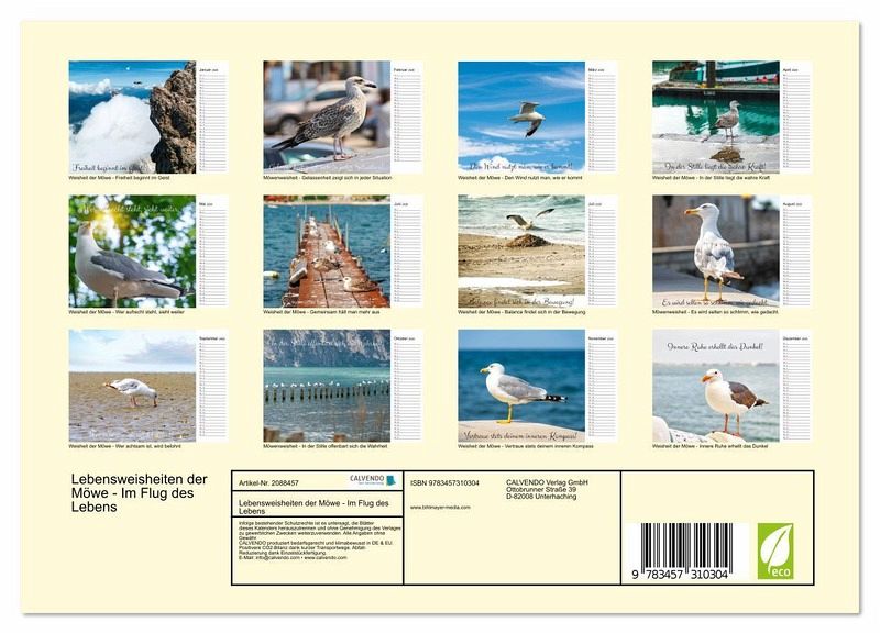 Dieser Motivationskalender und Familienkalender verbindet Möwenfotos mit tiefsinnigen Sprüchen, Zitaten und Lebensweisheiten. Als Spruchkalender für Achtsamkeit, Motivation und innere Ruhe ist er ideal für Zuhause, das Büro oder den stressigen Arbeitsplatz. Mit liebevoll gestalteten Bildern von Möwen und Vögeln lädt der Tierkalender jeden Monat zum Innehalten ein. Ob als Achtsamkeitskalender, Spruchkalender für die Arbeit oder zur persönlichen Motivation - die Kombination aus Tieren und Weisheiten wirkt beruhigend und stärkend zugleich. Der Motivationskalender wurde von www.bihlmayer-media.com erstellt und ist ein besonderes Geschenk für Frauen, Männer, Familien, Kollegen oder als Mitbringsel. Auch als Sprüchekalender mit Zitaten perfekt für jeden!