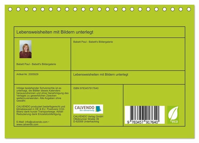 QUALITÄT - Hochwertiger Fotokalender mit 12 wunderschönen Motiven auf lichtbeständigem Bilderdruckpapier, robuste Spiralbindung.NACHHALTIG - deutliche Abfallreduzierung durch bedarfsgerechte Einzelstückfertigung, umweltfreundliches FSC-zertifiziertes Papier, Produktion in Deutschland, klimabewusste Logistik.PERFEKTES GESCHENK - Kalender für Freunde und Familie, für Kinder und Erwachsene, jung und alt, zu Weihnachten, Geburtstag oder zwischendurch.VIELFALT - Bildkalender in verschiedenen Formaten, z.B. DIN A5, DIN A4, DIN A3 sowie DIN A2. Ob Naturmotiv, Gemälde oder Fotos, ideal für ein persönliches Wohlfühlambiente.Farbenfrohe Bilder mit Lebensweisheiten versehen von Autor(in): Babett's Bildergalerie