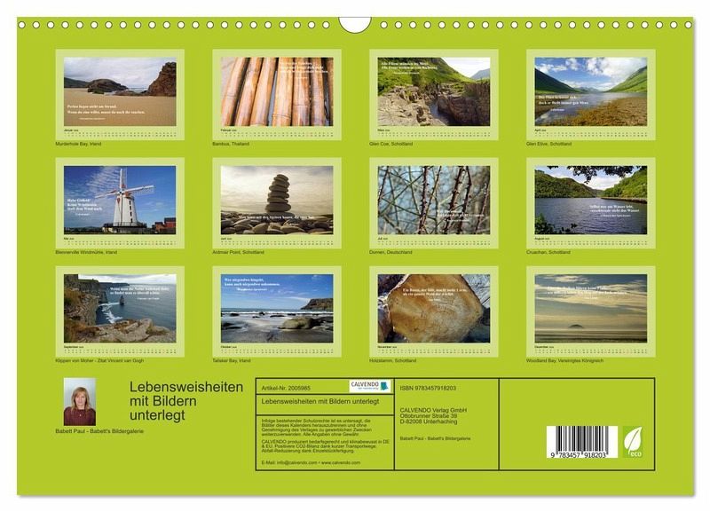 QUALITÄT - Hochwertiger Fotokalender mit 12 wunderschönen Motiven auf lichtbeständigem Bilderdruckpapier, robuste Spiralbindung mit Aufhängebügel.NACHHALTIG - deutliche Abfallreduzierung durch bedarfsgerechte Einzelstückfertigung, umweltfreundliches FSC-zertifiziertes Papier, Produktion in Deutschland, klimabewusste Logistik.PERFEKTES GESCHENK - Kalender für Freunde und Familie, für Kinder und Erwachsene, jung und alt, zu Weihnachten, Geburtstag oder zwischendurch.VIELFALT - Bildkalender in verschiedenen Formaten, z.B. DIN A5, DIN A4, DIN A3 sowie DIN A2. Ob Naturmotiv, Gemälde oder Fotos, ideal für ein persönliches Wohlfühlambiente.Farbenfrohe Bilder mit Lebensweisheiten versehen von Autor(in): Babett's Bildergalerie